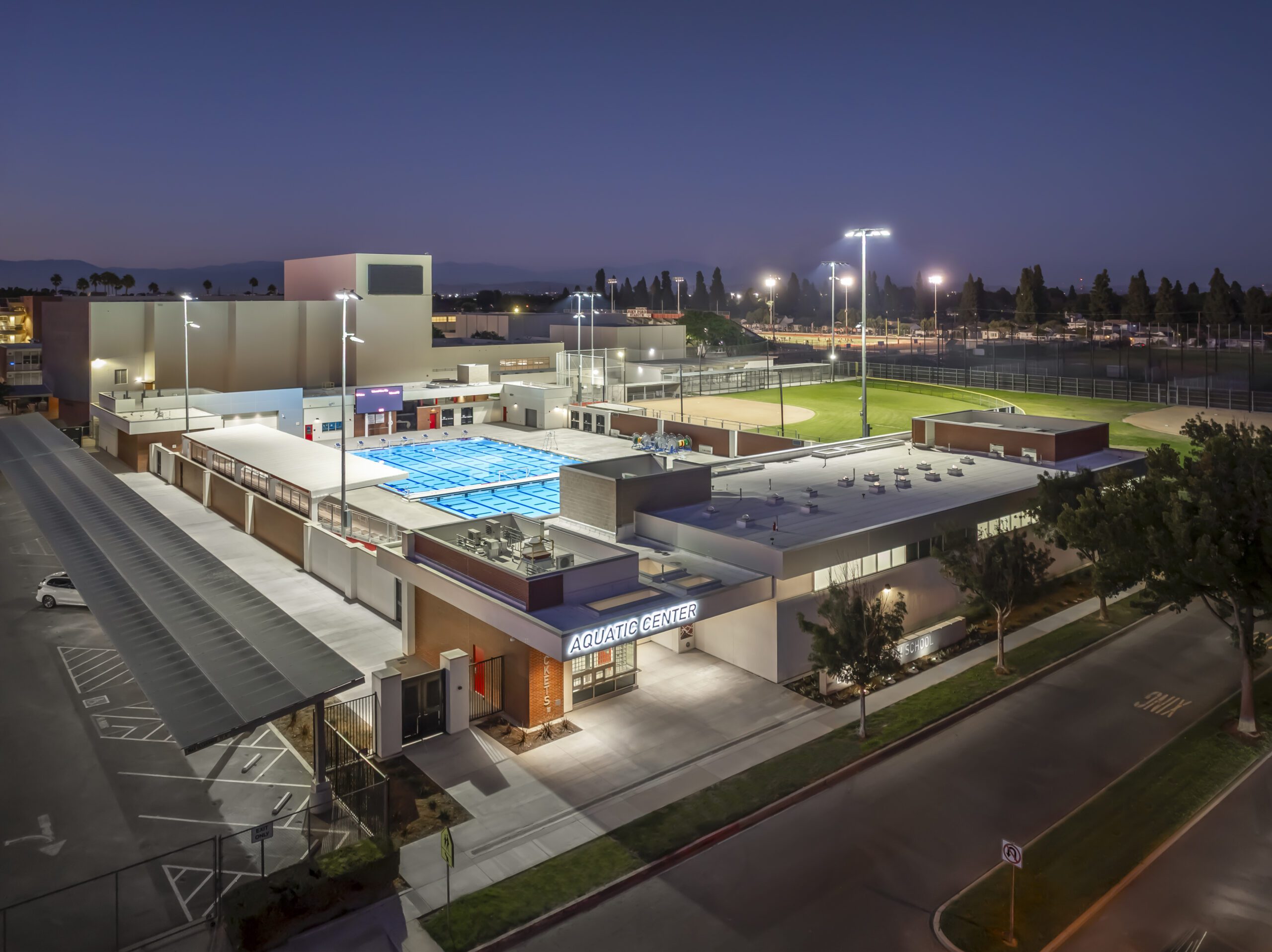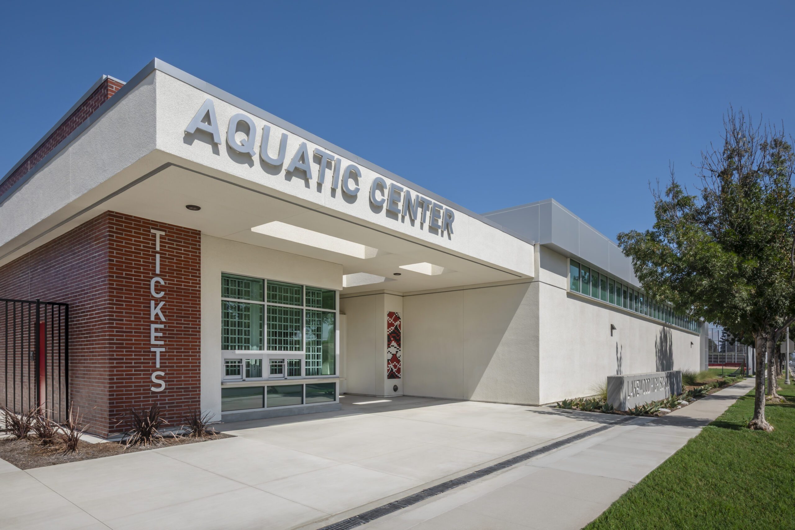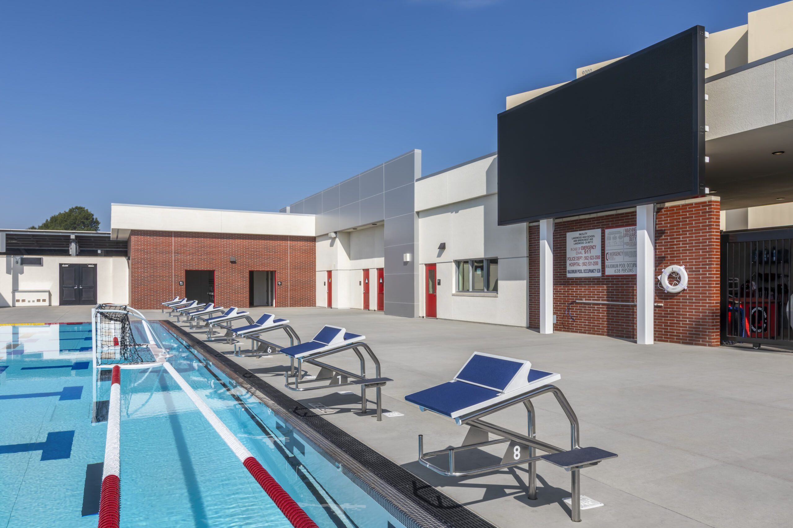 The project design criteria included a new Olympic sized Myrtha pool and deck, covered spectator seating, a snack bar and ticket booth, as well as gender-neutral locker facilities. To accommodate the new facility, existing softball fields, tennis courts, hardcourts, and portables buildings had to be relocated, creating a multi-phased approach to construction.