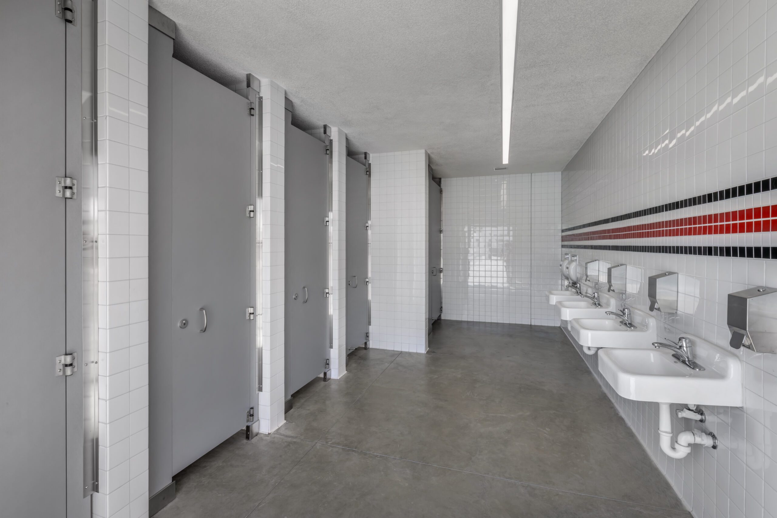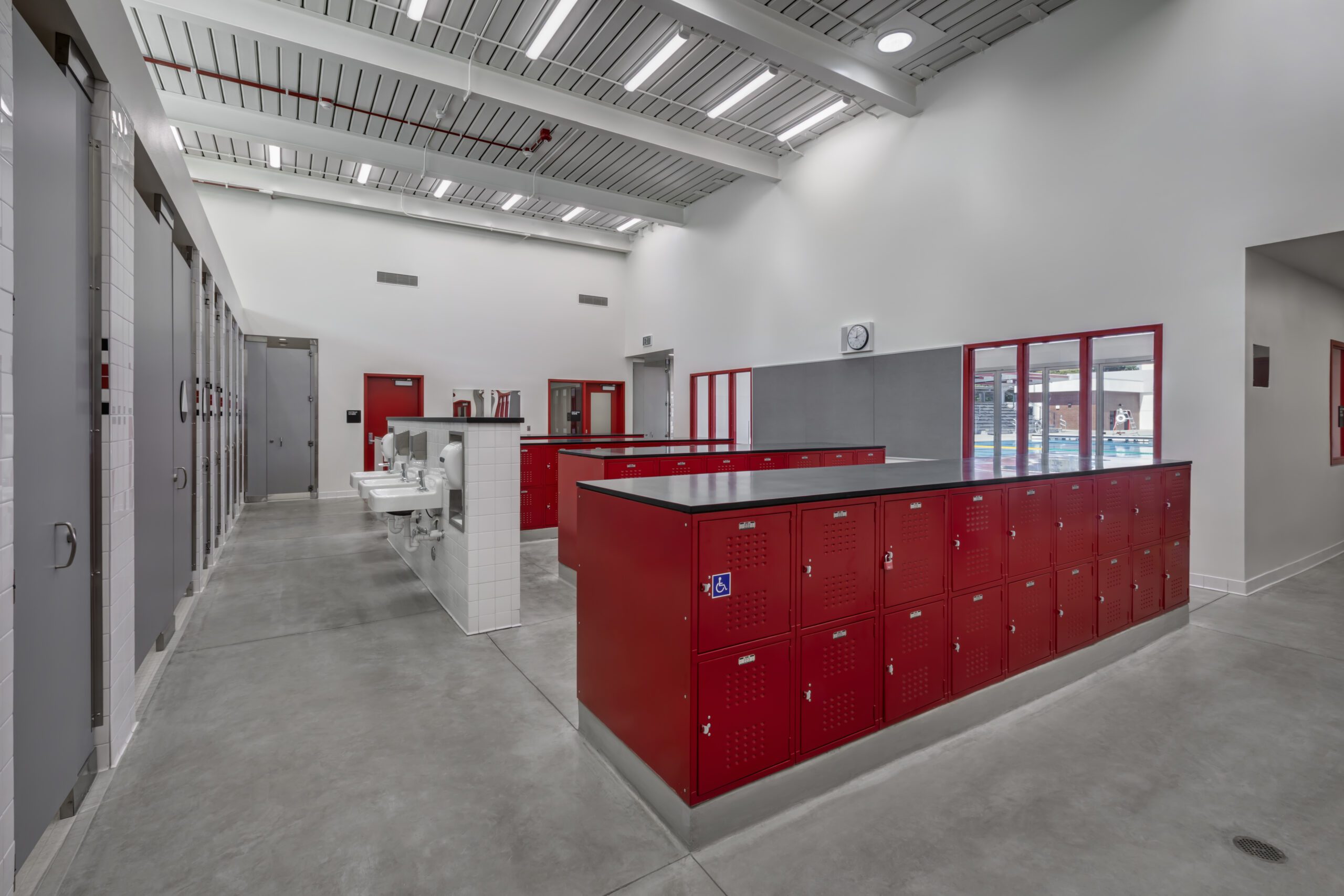 A central feature of this project is the high-profile locker room facility. It houses three designated changing areas, including a gender-inclusive space with individual combination shower and changing stalls to accommodate all students. The building also includes a multi-purpose classroom, coach offices, utility spaces, and restrooms.